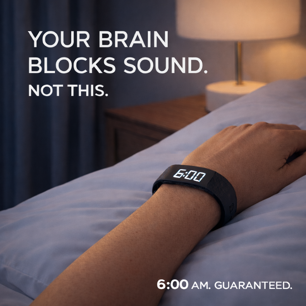 Sleeping through 10 alarms isn't laziness—it's biology. Your brain blocks repetitive sounds during deep sleep, which is why louder doesn't help. SomniPulse bypasses the sound barrier using touch, the same pathway that wakes you when someone shakes your shoulder. No more oversleeping, no cortisol panic, no groggy mornings.