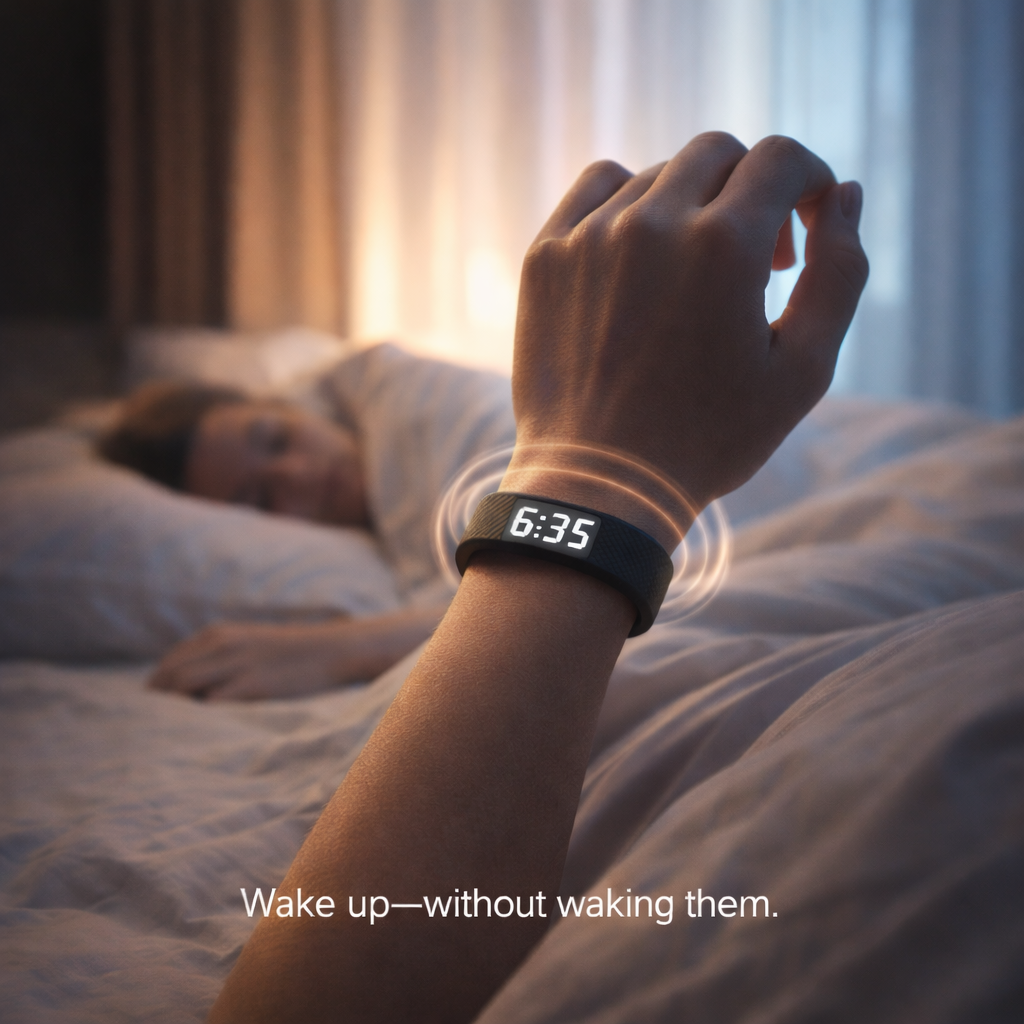 Your alarm doesn't have to be everyone's alarm. SomniPulse delivers a powerful vibration directly to your wrist—strong enough to wake you instantly, but completely silent to your partner. Unlike audio alarms that fill the room or weak smartwatch buzzes you sleep through, targeted vibration stays on your body. Start your day guilt-free while they keep dreaming.